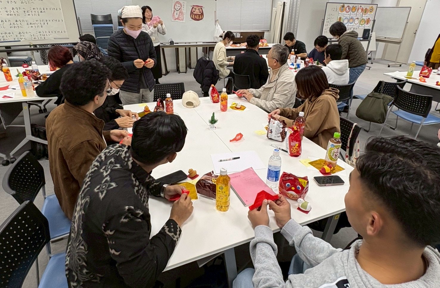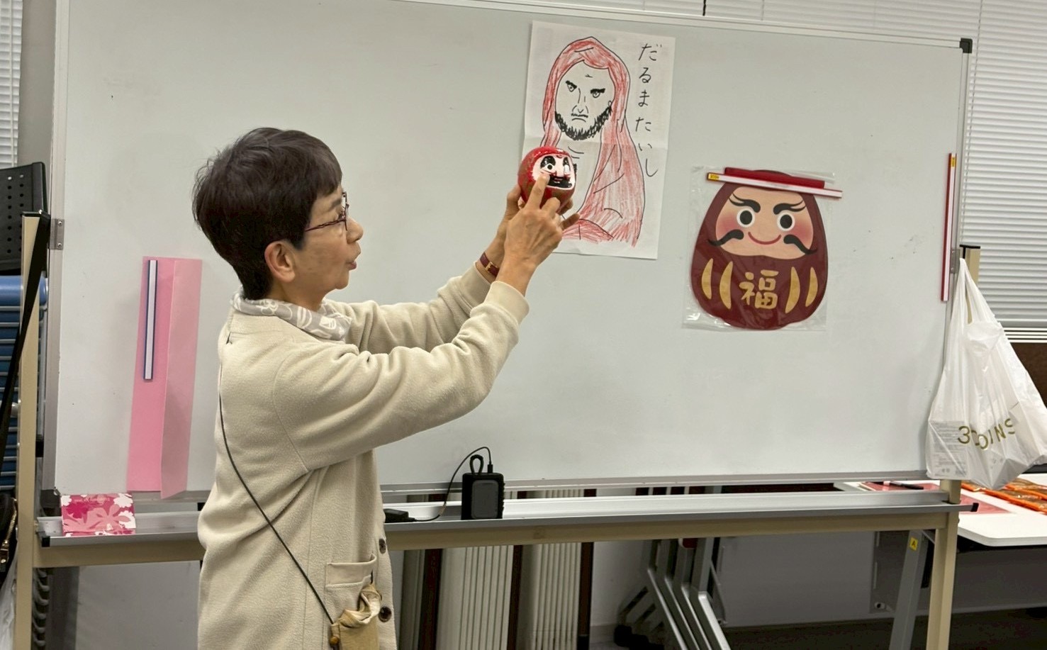 上右 かねた先生お正月 「だるま」のれきしとぶんかをはなしています。 下の写真向かって左 森下先生。だるまのおりがみをおしえてくれました。下の写真向かって右一番上のクラスのみなさんが森下先生のおてつだいで、みなさんにだるまのおりがみをおしえています。